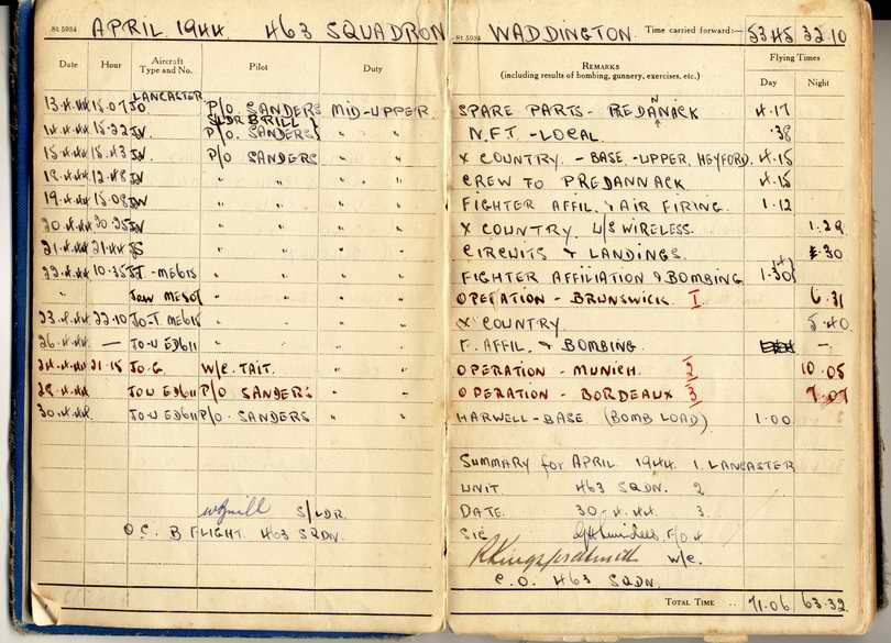 “We had a week or so’s training and on 22nd April, I did my first operation to Brunswick and the pilot was my regular pilot. On 24th April I did my second operation on Munich with Wing Commander Tate who used to visit the squadron and round up the few people who weren’t flying that night and make them up into a crew. Wing Commander Tate at that stage had flown over 100 bombing raids on Germany because early in the War, his wife and family living in London were bombed and killed by the Germans and Wing Commander Tate’s sole motivation from then on was to retaliate and kill Germans. So I flew to Munich with Tate and then following that on 28th April, four days later an operation at Bordeaux with my regular pilot.