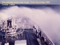 “We arrived at Ascension Island after dark. It was utter chaos as this planeload of people plus their kit bags were eventually offloaded from trucks onto a volcanic dust field in the dark. It took about five hours for people to find their kit bags by torchlight. Being a wily sailor I’d tied lengths of blue bunting to my kit bag so I found it pretty quickly. Otherwise they were all identical except for the little hand-written labels. Anyway we slept in tents that night and the next morning we got on board the corvette, HMS Dunbarton Castle which at least boasted a little flight deck aft but which was already loaded high with ammunition destined for the battlefleet.